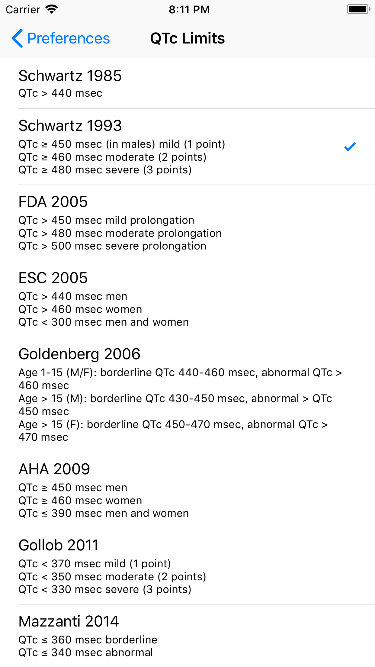 Here is another Pandora’s Box. Just as there are many QTc formulas, there are many papers dealing with establishing the normal QTc. Given syndromes of sudden death related to short QT intervals, both boundaries of normal need to be considered. I have gathered these papers together along with their QT interval cutoffs. These are often sex-specific, and sometimes gradations of abnormality are assigned, e.g. borderline and abnormal, or mildly, moderately, or severely prolonged. In the app the user can select from among these published criteria to define whether a result is normal or not. In practical clinical use, the QTc interval is only one component in the risk scales needed to establish the diagnosis of long or short QT syndrome.
